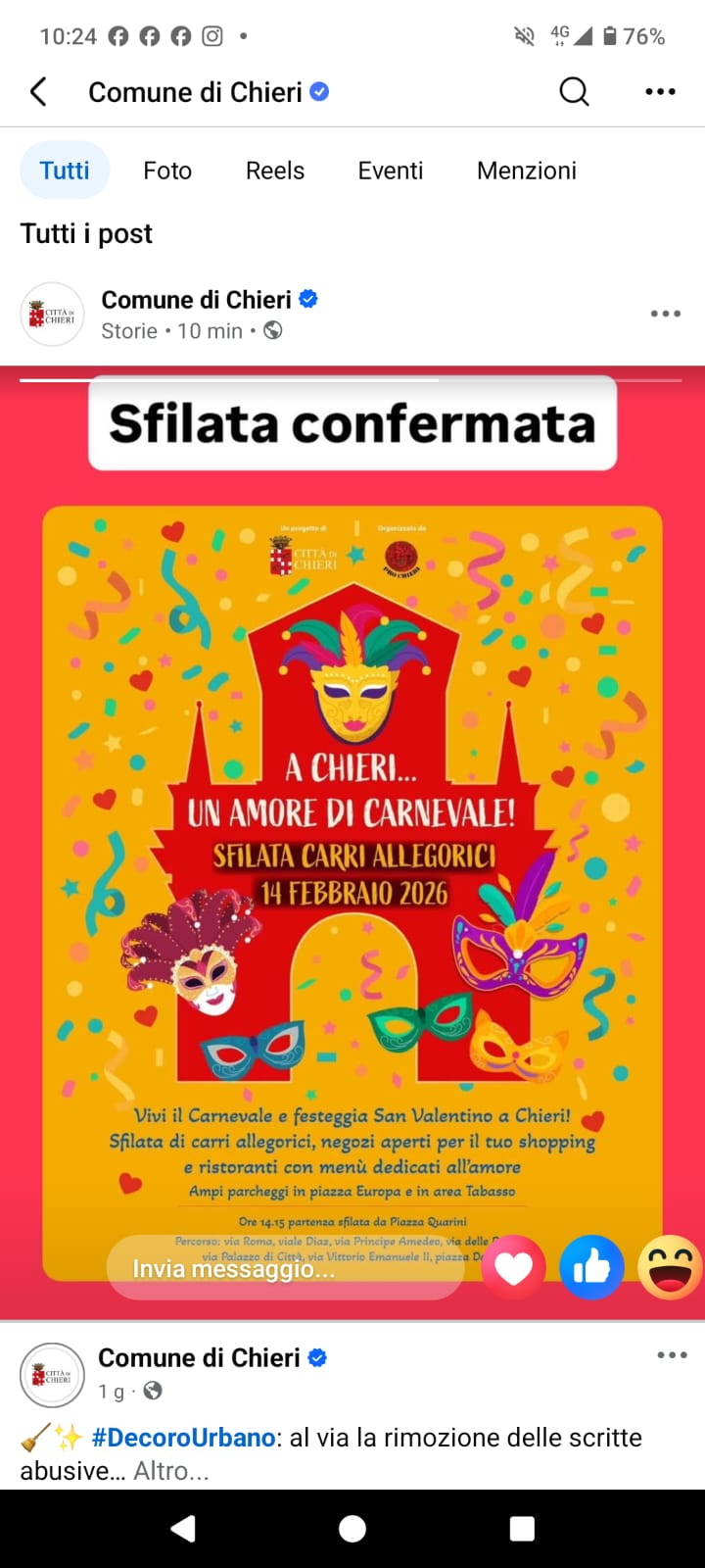 CHIERI. La sfilata dei carri vista dal droneChieri. Carnevale con pochi carri ma tanta allegriaAsti-Villafranca d’Asti. Scontro frontale sulla statale 10. Due morti e due feriti graviChieri. Carnevale, Comune e Pro Loco: “Sfilata confermata” partenza alle ore 15,00 da Piazzale Quarini. PIEMONTE ARTE: LE OLIMPIADI DI ZAGO A CORTINA, KLIMT A SAVIGLIANO, DE-COLL’ A CHIERI DAL 20 FEBBRAIO, MOSTRA FOTOGRAFICA F8 CHIERI, IL RIFLESSO DI LEONARDO, FOTOGRAFIA A VINOVO, SBAM! A CHERASCO, FRACCARI…Chieri. Sabato 14 febbraio il Carnevale di San ValentinoCHIERI. La sfilata dei carri vista dal droneChieri. Carnevale con pochi carri ma tanta allegriaCarmagnola. Auto tampona trattore sulla provinciale 134. Un feritoChieri. “Sveglia!”, il libro di Senaldi presentato in bibliotecaVolvera-Pinerolo. Auto prende fuocoPinerolese. Investe una donna a None e scappa. Poi si presenta: denunciataPallavolo A1 femminile. Igor Novara, domani il derby con Cuneo per mantenere il quarto postoTORINO: RAPINA UN ANTIQUARIO. LA POLIZIA DI STATO ARRESTA L’AUTORE. IL BOTTINO, FRA DENARO E GIOIELLI, AMMONTAVA A CIRCA 28000 €Ivrea. Controlli per il Carnevale. Ubriachi alla guida, droga e un 25enne di Nichelino denunciato per porto d’armiAsti-Villafranca d’Asti. Scontro frontale sulla statale 10. Due morti e due feriti graviChieri. Carnevale, Comune e Pro Loco: “Sfilata confermata” partenza alle ore 15,00 da Piazzale Quarini.Chieri. Bela Tessioira e Mangiagrop in visita ai bambini e agli anzianiCanavese, autostrada Torino-Aosta. Verifiche tecniche, chiusura notturna tra venerdì 13 e sabato 14 tra San Giorgio Canavese e VolpianoNuova truffa su Whatsapp: la segnala la Polizia Postale. Cosa fare per proteggersiPino Torinese. Sabato 14 al Centro Tosco di Valle Ceppi la Festa di CarnevaleDOMENICA 22 FEBBRAIO SI CAMMINA SULLE ORME DI SALGARI CON L’ASSOCIAZIONE “CAMMINARE LENTAMENTEVercelli. I Carabinieri recuperano refurtiva agricola per oltre 100.000 euro: un arrestoAlba: modifiche alla viabilitĂ per il funerale della signora Maria Franca Fissolo Ferrero1234512345678 Visto da: 257.515