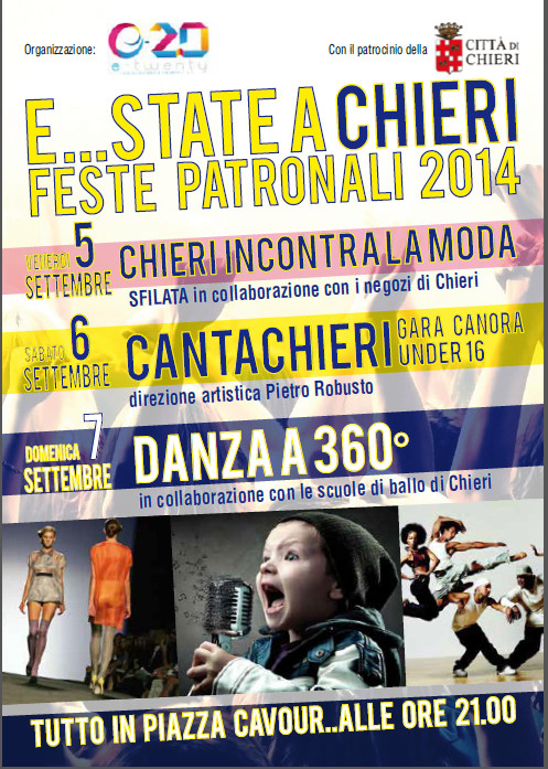Con l’organizzazione di E-20 e il patrocinio del Comune, va in scena un fine settimana di appuntamenti con la moda, la musica e la danza, in Piazza Cavour. La mini-rassegna, dal titolo “E…state a Chieri”, inizia venerdì 5 settembre con “Chieri incontra la moda”, in collaborazione con i negozi di Chieri. Sabato 6 tocca al “Cantachieri”, la gara canora per under 16 curata da Piero Robusto. Infine, domenica 7, “Danza a 360°”, in collaborazione con le scuole di ballo di Chieri.