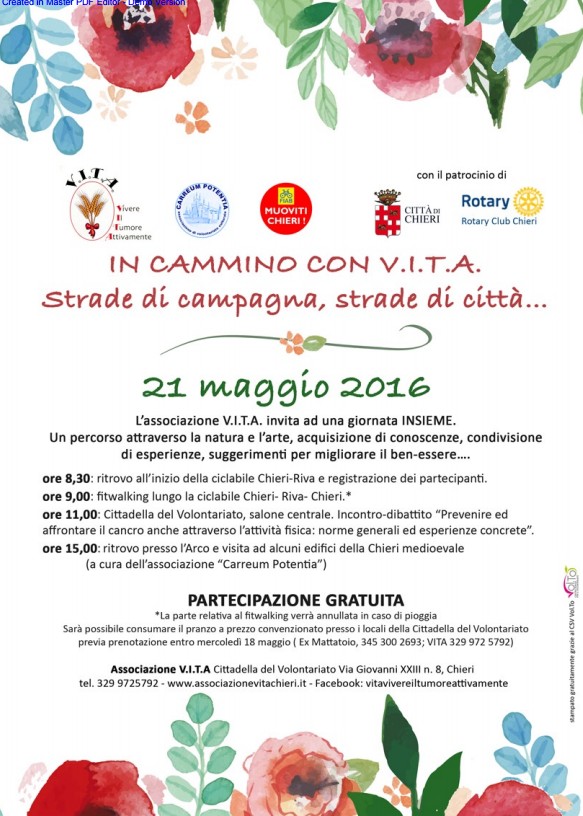 Chieri, sabato 21 maggio “IN CAMMINO CON V.I.T.A. ( Vivere Il Tumore Attivamente)”