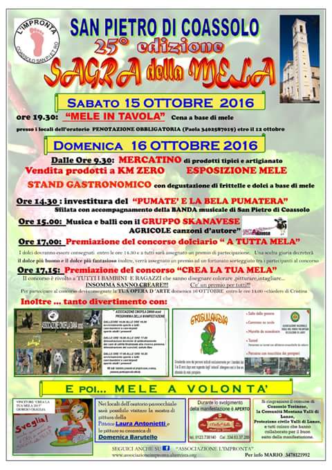 Sabato 15 Ottobre e Domenica 16 Ottobre San Pietro di Coassolo darà il via alla 25 ° edizione della sagra della mela. Si inizierà Sabato 15 settembre con “ mele in tavola” cena a base di mele alle ore 19:30 e la cena si svolgerà presso i locali dell’oratorio , per prenotarsi sarà sufficiente chiamare la signora Paola al 3402587019 , l’evento proseguirà anche Domenica16 Ottobre con la premiazione del concorso “ crea la tua mela” e nel pomeriggio alle ore 15:00 si ballerà con il gruppo canavese agricole canzoni d’autore ed alle ore 17:00 ci sarà un’altra premiazione del concorso dolciario “ a tutta mela”.