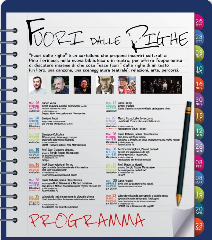 fuori-righe“Fuori dalle righe” è il cartellone proposto dall’Amministrazione Comunale che propone incontri culturali a Pino Torinese, nella nuova biblioteca o in teatro, per offrire l’opportunità di discutere insieme di cosa “esce fuori” dalle righe di un testo (un libro, una canzone, una sceneggiatura teatrale): relazioni, arte, percorsi.