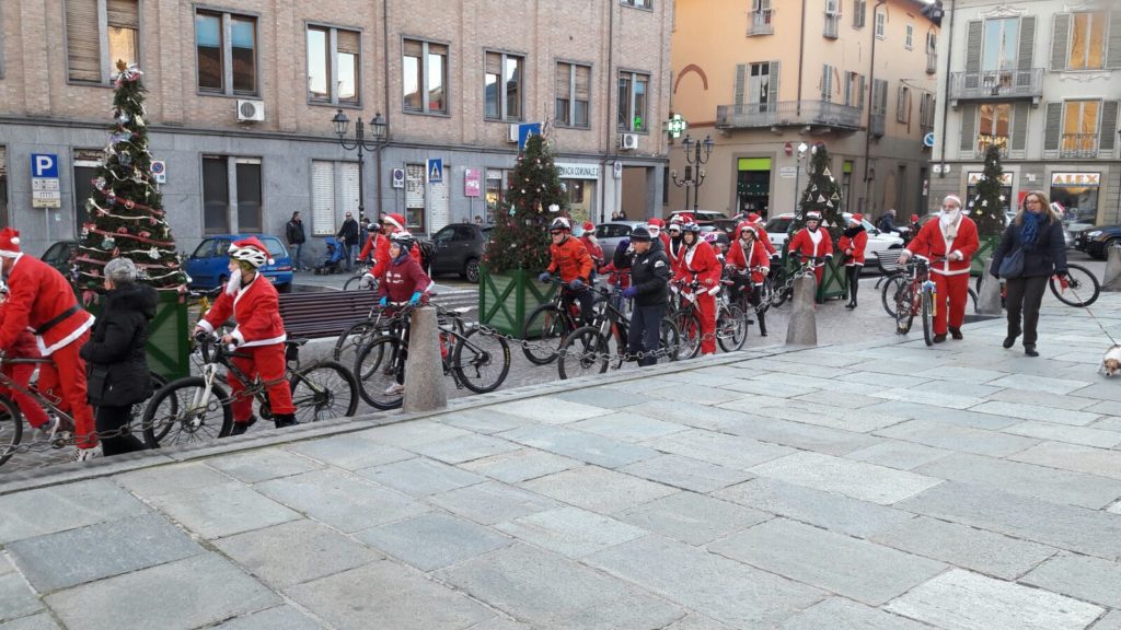 Natale a Chieri, con Babbi Natale in bicicletta e rumeni in costume