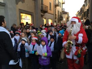 Manca una settimana a Natale ed il centro di Chieri è in fermento. Le luci natalizie illuminano una via Vittorio Emanuele II che é tutta un brulicare di gente: bambini, genitori, anziani si godono il clima prenanalizio ammirando le vetrine, oppure facendo un giro al mercato allestito in via Palazzo di Città. Passeggiando per le strade in questo periodo, é facile imbattersi in Babbo Natale che distribuisce caramelle ai bimbi che incontra. Ma questa domenica è speciale: i Babbo Natale suonano, cantano e vanno perfino in bicicletta. Dalle 16,30 alle 18 la Filarmonica chierese e gli allievi della Scuola Primaria Santa Teresa hanno allietato i passanti offrendo loro musica e canti di Natale; la comunità Rumena ha percorso le vie del centro con balli e danze tipiche del proprio paese, un gruppo di ciclisti ha percorso le strade in sella … e tutti rigorosamente in costume natalizio. Una bella esperienza per grandi