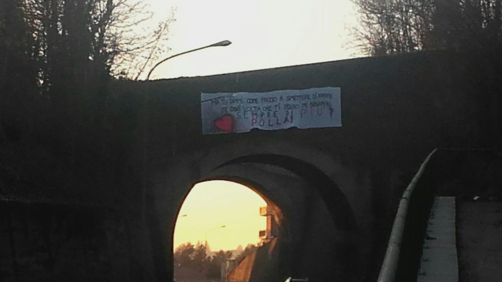 E’ comparso per qualche giorno, sul piccolo ponte che scavalca l’ex statale a Porta Garibaldi, uno striscione ben visibile da chi passa sotto in auto: un messaggio d’amore, personalizzato, per la ragazza del cuore. La novità è doppia: primo, perché c’è del rispetto per l’ambiente, lo striscione non sporca, le scritte di vernice spruzzata invece sì; secondo, perché dai ponti, negli ultimi tempi, i ragazzi scelleratamente gettano sassi, non messaggi d’amore. Lo striscione, dopo qualche giorno, è stato tolto: forse ha raggiunto lo scopo. Intanto, a Natale, è un gesto ancora più carino… (G.G.)