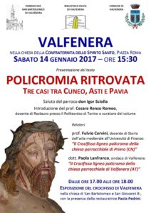 Sabato 14 gennaio alle 15:30 verrà presentato a Valfenera, nella Chiesa della Confraternita dello Spirito Santo, in piazza Roma, il libro ‘Policromia ritrovata’ curato dal prof. Cesare Renzo Romeo. Nel volume scientifico sono raccolti gli interventi di restauro che hanno riguardato tre preziose opere d’arte: il Crocifisso ligneo quattrocentesco della parrocchia di Priero (Cn), il Cristo di Valfenera e l’affresco della Crocifissione e Santi di Gravellona Lomellina (Pv). Con il restauro sono stati riportati allo splendore originario i Crocifissi lignei di Priero e di Valfenera e riscoperta la loro caratteristica policromia che era stata offuscata da una grossolana verniciatura a tempera.