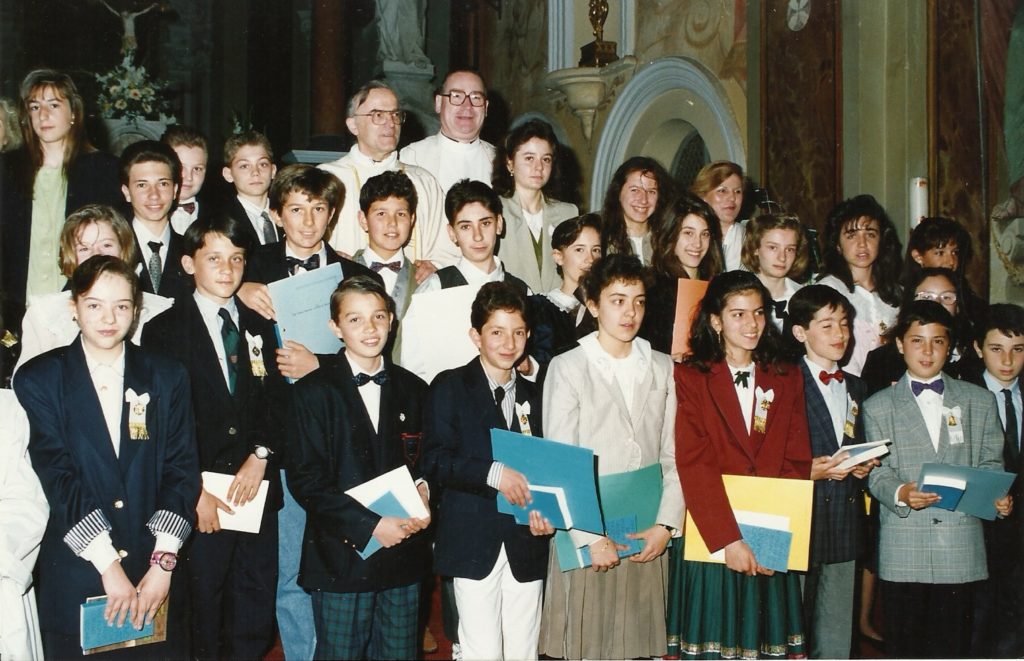 Ricordi e immagini di Don Giovanni Vignola, scomparso qualche giorno fa a 78 anni e ricordato con affetto dai pinesi. E’ stato Parroco nella Chiesa SS. Annunziata di Pino Torinese dal 1979 al 1995. Prese possesso della Parrocchia il 1° dicembre 1979. Nato a Caramagna Piemonte il 9 marzo 1938, proveniva da Vallongo di Carmagnola. Nel settembre 1995 accettò, dal Card. Saldarini Arcivescovo di Torino, il trasferimento a Pancalieri e l’incarico di addetto all’Ufficio Diocesano Fraternità Clero. Nella foto di Mirella Mosso, lo vediamo con un gruppo di cresimandi negli anni Ottanta