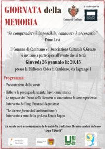 Cambiano, giovedì 26 gennaio una veglia per il Giorno della Memoria