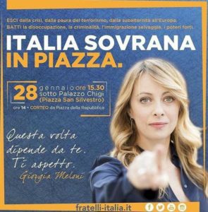 “Il Circolo FdI-AN Chieri sabato 28 gennaio sarà a Roma, davanti a palazzo Chigi, per manifestare insieme a tutto il Centrodestra contro inciuci, poteri forti, subalternità all’ Europa dei burocrati e dell’ alta finanza, immigrazione clandestina incontrollata e neoschiavista e per mettere al primo posto la sovranità Nazionale, aspetto fondamentale per realizzare gli interessi degli Italiani. È necessaria pertanto la costituzione di un polo identitario e sovranista che abbia come caratteristiche che lo contraddistinguono la coerenza e la rapida messa in atto di politiche forti che mettano al primo posto gli Italiani; è necessario pertanto andare a votare il più presto possibile per evitare di perdere tempo prezioso e per invertire il declino economico, sociale e morale di una Nazione che deve tornare ad essere libera e indipendente per garantire quei diritti fondamentali che caratterizzano una democrazia avanzata, in primis quello di votare per eleggere i propri rappresentanti.” Lo rende noto Karol Vaccaro, responsabile di zona di FdI-AN