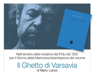 Nell’ambito delle iniziative organizzate dal Polo del ‘900 per il Giorno della Memoria, la presentazione del volume “Il Ghetto di Varsavia” di Mario Lattes, che si terrà sabato 28 gennaio 2017 alle ore 17.30 presso la Sala lettura di Palazzo San Daniele (via del Carmine 14, Torino). Interverrà il professore Giacomo Jori, curatore del volume, e saranno presenti Caterina Bottari Lattes e Adolfo Ivaldi, Presidente della Fondazione Bottari Lattes. Giovedì 26 gennaio, in diretta durante il Tg Rai Piemonte delle ore 19.30, il professor Jori sarà intervistato sulle tematiche del volume “Il Ghetto di Varsavia”. Inoltre, sono in programma due reading musicali, ispirati al libro di Mario Lattes, in collaborazione con l’Associazione Amici della Musica di Savigliano: venerdì 27 gennaio a Savigliano (ore 21, Palazzo Taffini) e sabato 28 gennaio a Racconigi (ore 21, Chiesa Santa Croce). Letture a cura di Elena Zegna, con Ubaldo Rosso (flauto) e Bruno Manassero (pianoforte).