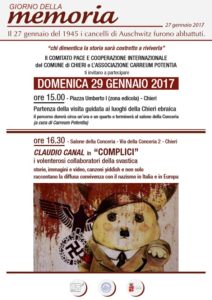 Domenica 29 gennaio, a partire dalle 15, il Comitato Pace e Cooperazione Internazionale del comune di Chieri e l’associazione Carreum Potentia, in occasione del Giorno della Memoria, invitano a partecipare all’evento “Chi dimentica la storia sarà costretto a riviverla”.