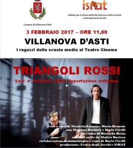 Alle ore 11 del 3 febbraio, presso il cinema comunale, l’ISRAT organizza, insieme al Comune di Villanova d’Asti e l’istituto Comprensivo di Villanova d’Asti, uno spettacolo teatrale del “Teatro degli Acerbi”. E’ una rappresentazione, a cui parteciperanno le classi terze della scuola secondaria di primo grado, molto significativa perchè ripercorre la tragedia della seconda guerra mondiale, nella quotidianità dei campi di concentramento attraverso le parole degli astigiani, con immagini di repertorio, che hanno vissuto quell’infame situazione.