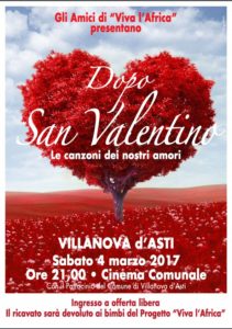 A Villanova d’Asti, presso il Cinema Comunale, sabato 4 marzo a partire dalle ore 21:00, una serata con le più belle canzoni d’amore cantate dagli “Amici di Viva l’Africa”. L’ingresso è gratuito con offerta libera a favore del progetto “Via L’Africa” di cui si parlerà più approfonditamente nella serata. E’ la seconda serata che organizzata a Villanova con questo gruppo di Amici-Volontari che fanno beneficenza, divertendo e divertendosi.