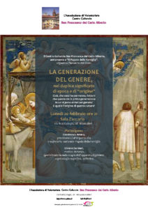 Il Centro Culturale “San Francesco del Carlo Alberto” invita all’incontro, organizzato in collaborazione con “Il Popolo della Famiglia”, Lunedì 20 febbraio ore 21  – via Real Collegio, 28 – Moncalieri. La generazione del genere, nel duplice significato di epoca e di “origine” . Cioè, che cosa ha permesso, fatto sì che questa sia la prima generazione in cui si pone enfasi sul genere?   E qual è l’origine di questa cultura?       Intervengono:          Gianfranco Amato,    presidente dei “Giuristi per la Vita” e segretario  nazionale del “Popolo della Famiglia”; Silvana De Mari,   medico chirurgo, specializzata in endoscopia dell’apparato digerente e  psicologia cognitiva, scrittrice.