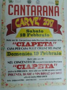 Carnevale come da tradizione a Cantarana. Il Carvè 2017 avrebbe dovuto partire ieri, sabato 18 febbraio, con la “Ciapeta”, sfilata casa per casa sulle colline del paese che ricorda il passaggio degli stagnini di un tempo col loro fragoroso e allegro modo di attirare l’attenzione. Purtroppo il maltempo ha fatto sospendere la sfilata.