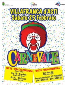 Villafranca d’Asti. Sfilata in maschera e cena di Carnevale sabato 25 febbraio.