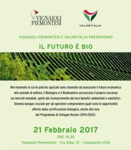 Il Futuro è Bio: è questo il titolo del convegno organizzato martedì 21 febbraio da Valoritalia e Vignaioli Piemontesi a Castagnito, nella sede in via Alba 15. Nel momento in cui le politiche agricole sono chiamate ad assicurare il futuro economico alle aziende di settore, il biologico e il biodinamico accrescono il proprio successo sui mercati mondiali, spinti dal crescente riconoscimento dei loro benefici ambientali e salutistici. Per questa ragione diventa cruciale per gli operatori comprendere quali siano le opportunità di crescita offerte dalla certificazione biologica, anche alla luce del Programma di Sviluppo Rurale 2014-2020.