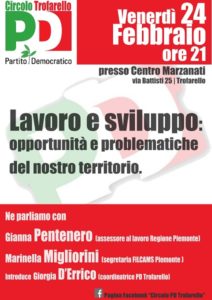 Venerdì 24 febbraio alle ore 21, presso il Centro Marzanati di Trofarello in via Cesare Battisti 25, il Partito Democratico cittadino organizza una iniziativa con l’Assessore Regionale al Lavoro Gianna Pentenero e la segretaria Regionale della Filcams CGIL Marinella Migliorini dal titolo” Lavoro e sviluppo: opportunità e problematiche del nostro territorio”.