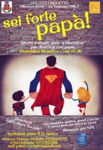 Il consorzio Co.Al.A:, nella domenica della Festa del Papà, il 19 marzo a partire dalle ore 15:00, organizza presso la sede di Palazzo Richetta tramite il suo servizio “Eduambiente”, col il patrocinio comunale, l’iniziativa “ Sei forte papà”. L’occasione gioviale, tra giochi di gruppo e laboratori divertenti, è di stare in compagnia del proprio papà in particolare, dei propri cari e di tutti i partecipanti per passare una giornata spensierata.