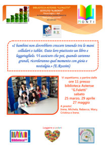 Fino a maggio, insieme a Irene, Michela, Rebecca, Mary, Cristina e Irene, bambini e genitori potranno ascoltare fiabe, filastrocche e racconti tutti gli ultimi sabati del mese (25 marzo, 29 aprile e 27 maggio).