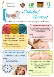 La Biblioteca Jacomuzzi di Cambiano propone altre quattro serate sulla salute. Venerdì 24 Marzo alle ore 21 il Dott. Bertazzo e la Dott.ssa Colenghi ci parleranno di Ansia, Depressione e Insonnia. Ci aiuteranno a comprendere meglio e ad affrontarli con consigli pratici. Il 17 Aprile si parlerà di Intestino e di due disturbi molto diffusi; dell’intestino irritabile e di stitichezza ce ne parleranno la Dott.ssa Cristina Caldelara e il Dott. Armando Vellano. Gli altri due appuntamenti si svolgeranno il 21 Aprile e il 5 Maggio. Nel primo il Dott. Marco Aggeri e la Dott.ssa Aurora Grassi, assessore alla cultura e alla sanità di Cambiano, ci parleranno di Menopausa. Un argomento utile non solo per le dirette interessate ma, anche per chi vive a stretto contatto con loro. Ci aiuteranno a capire cosa accade in questo periodo particolare nel corpo, nella mente e negli affetti delle donne. Ultimo appuntamento della serie, “ Callura dei piedi: dalla Dermatosi alle Malformazioni”. Relatore dell’ incontro il Dott. Gianluca Traversore. ( A. R.)