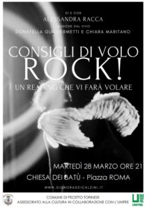 Martedì 28 marzo a Pecetto, alle ore 21, nella chiesa dei Batù in Piazza Roma, il Comune in collaborazione con l’UniTre presenta “Consigli di volo Rock – Un reading che vi farà volare”, di e con Alessanmdra Racca – musiche dal vivo di Donatella Gugliermetti e Chiara Maritano.