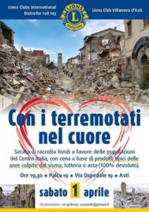 Segnaliamo un importante evento di raccolta fondi per i terremotati del centro Italia organizzato dal Lions Club di Villanova d’Asti.