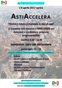 AstiAccelera! Si chiama così la giornata di lavori che il Pd astigiano ha organizzato insieme ad Angela Motta per scrivere il programma della sua lista elettorale. Una scrittura condivisa con i cittadini che sono invitati a partecipare, sabato 8 aprile, al confronto e a fare proposte per il territorio.