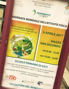 In occasione della giornata mondiale dell’attività fisica, gli Assessorati allo Sport e al Turismo della Città di Asti, in collaborazione con il Servizio Istruzione, organizzano un evento di promozione della cultura del benessere e del movimento che si terrà il giorno 6 aprile 2017 nelle piazze San Secondo e Statuto, rivolto al secondo ciclo della scuola primaria.