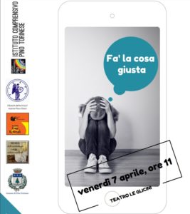 Venerdì 7 aprile alle h. 11,00 del mattino al Teatro Le Glicini uno spettacolo proposto dai ragazzi delle classi V delle scuole elementari di Pino sul tema del bullismo intitolato “Fa’ la cosa giusta”. Iniziativa promossa dalla Fidapa, Istituto Comprensivo, Sportello Scuola Volontariato e con il Patrocinio del Comune di Pino.