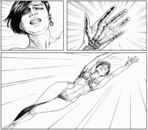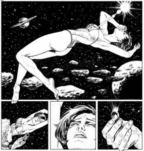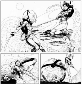 “Le lacrime del diavolo” procede con un ritmo perfetto, scandito su trama solida e lineare – se pur ricca di flashback – grazie allo splendido lavoro di Val Romeo. Anche lei non è una disegnatrice che se la tira, non cerca di stupire con trovate autoriali, eppure le sue tavole si fanno guardare e riguardare. Linee sottili e morbide che conferiscono plasticità ai personaggi e profondità alle tavole, neri solo quando indispensabili, per lasciare spazio ai toni di grigio dello Studio Arancio e al rosso. E poi cosa dire della varietà di caratterizzazioni? Da fare invidia alla maggior parte dei disegnatori, di oggi e del passato, anche per personaggi che compaiono in poche vignette, come il capitano Grigorjev e la vincitrice del concorso canoro Sheyla Le Boef. Tavole spettacolari – come quelle del film “Blood and blades on Mars” e dell’incubo di Igraine – e tanta, tanta espressività nella recitazione dei personaggi unite ad grande attenzione ai particolari.