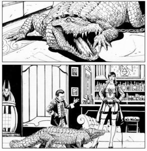“Le lacrime del diavolo” procede con un ritmo perfetto, scandito su trama solida e lineare – se pur ricca di flashback – grazie allo splendido lavoro di Val Romeo. Anche lei non è una disegnatrice che se la tira, non cerca di stupire con trovate autoriali, eppure le sue tavole si fanno guardare e riguardare. Linee sottili e morbide che conferiscono plasticità ai personaggi e profondità alle tavole, neri solo quando indispensabili, per lasciare spazio ai toni di grigio dello Studio Arancio e al rosso. E poi cosa dire della varietà di caratterizzazioni? Da fare invidia alla maggior parte dei disegnatori, di oggi e del passato, anche per personaggi che compaiono in poche vignette, come il capitano Grigorjev e la vincitrice del concorso canoro Sheyla Le Boef. Tavole spettacolari – come quelle del film “Blood and blades on Mars” e dell’incubo di Igraine – e tanta, tanta espressività nella recitazione dei personaggi unite ad grande attenzione ai particolari.