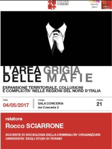 L’Amministrazione Comunale di Chieri invita all’incontro di giovedì 4 maggio alle ore 21, in Sala Conceria – via della Conceria 2 con Rocco SCIARRONE, Docente di Sociologia della Criminalità Organizzata all’Università degli Studi Torino, che ci parlerà del delicato tema dell’espansione delle mafie nelle regioni del Nord Italia.