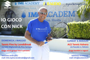 Arriva a Torino l’evento tennistico dell’anno: Nick Bollettieri, il guru del tennis mondiale, terrà due giornate di lezioni, consigli e stage. I clinic, in collaborazione con Synchronicity, Circuito Sabaudo Tennis Veterani e IMG Academy, la sua prestigiosa scuola tennis in Florida, rappresentano un’occasione imperdibile per tutti gli appassionati. Domenica 7 maggio l’appuntamento sarà al Tennis Club Love & Break di Pino Torinese con quattro sessioni, due al mattino e due al pomeriggio, e sarà rivolto a tutte le fasce di età. Il pomeriggio di lunedì 8 maggio all’Ace Tennis Volvera verrà, invece, dedicato prevalentemente ai ragazzi. Nick Bollettieri scenderà in campo per lavorare sui fondamentali, per dare consigli sull’approccio alla partita, per far conoscere tecniche mentali e strategie di gioco. Nelle sedute di allenamento, sarà disponibile per ogni richiesta e necessità, pronto a dare indicazioni e suggerimenti, a trasferire la sua enorme esperienza ai tennisti e alle tenniste che parteciperanno allo stage.