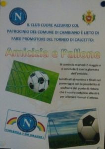 Con il patrocinio del Comune di Cambiano, il Club ha organizzato un torneo con una ottantina di partecipanti. Tutti accomunati da una sola convinzione” lo Sport per consolidare l’ amicizia tra le squadre. Ricordare che anche se si gioca per vincere, non dobbiamo dimenticare il principio principe:  quello di divertirsi insieme”. Mi spiega Pietro Mitrione Presidente e promotore dell’ evento, insieme al direttivo Napoli Club Cuore Azzurro. “ Abbiamo scelto , anche questa volta l’ Oratorio di Cambiano, non solo per la sua centralità e per il suo essere raccolto ma principalmente perché, meglio di altri luoghi rappresenta lo spirito e le motivazioni che vogliamo dare al torneo. Il no alla violenza, alla droga, no al razzismo e senza mai dimenticare chi è stato più sfortunato di noi”. Il Club promuove anche iniziative sociali, culturali e di volontariato. Spesso è tramite e promotore di iniziative di integrazione tra nord e sud con eventi artistici di origine partenopea. Il torneo iniziato il 2 maggio terminerà il 13 dello stesso mese con le finali e con le premiazioni. Saranno presenti autorità politiche, religiose e sociali. Tutto inizierà nel primo pomeriggio, e alla fine ci sarà la braciata e il  classico panino di salciccia e friarielli. Sabato 13 maggio all’ Oratorio di Cambiano c’ è una festa, venite leggeri perché ci penseranno loro a riempirvi la mente con un bel gioco, il cuore con l’ amicizia e lo stomaco con una specialità ..da non perdere. Partecipando si vincerà su tutti i fronti.( Antonella Rutigliano )