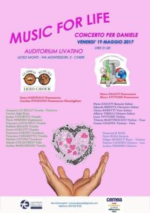 Venerdì 19 maggio , presso l’Auditorium Livatino del Liceo Monti, si terrà il concerto musicale “Music for life”. L’evento, ad ingresso libero, inizierà alle ore 21 e vedrà la partecipazione di allievi dell’Istituto, alcuni studenti del Liceo classico e musicale “Cavour” di Torino e la band locale “Desmond & Molly”. Il concerto è stato organizzato per raccogliere fondi per Daniele, un alunno dell’Istituto Monti. Il ragazzo soffre di fibrosi cistica e, dopo che avrà affrontato un trapianto di polmoni, necessiterà di un’accurata assistenza. Il ricavato delle offerte libere sarà quindi devoluto al C.E.M.E.A. di Torino. L’iniziativa del concerto, proposta dagli amici di Daniele, è un esempio di aiuto concreto. Inoltre l’evento costituisce una grande occasione per informarsi, sensibilizzarsi ed imparare dai giovani come condividere le difficoltà.