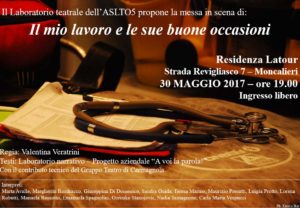 “Il mio lavoro e le sue buone occasioni” è il titolo di un intrigante spettacolo teatrale che andrà in scena il prossimo 30 maggio alla residenza Latour di Moncalieri. I testi sono stati curati dal laboratorio narrativo dell’Asl TO5 nell’ambito del progetto aziendale “A voi la parola”. Le scenografie, costumi e allestimenti sono stati scelti con il contributo tecnico del Gruppo Teatro di Carmagnola. Gli interpreti sono tutti operatori dell’Asl To5 che hanno aderito al progetto aziendale. Inizio dello spettacolo ore 19, ingresso libero.