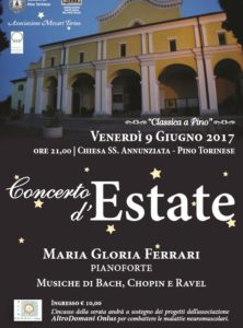 Ultimo concerto ( il quinto ) della Rassegna “Classica a Pino” che ha visto musicisti di eccellenza esibirsi a Pino Torinese il cui risultato positivo è stato molteplice: da una parte i musicisti soddisfatti per la speciale acustica che favorisce la loro performance, dall’altra l’affezionato e sempre più competente pubblico, l’Amministrazione Comunale che sponsorizza l’evento, è contenta per la notevole affluenza ed infine, il M° Issoglio che vede premiata la costanza e tenacia dimostrata da diversi anni nella convinzione che “ se si portano a Pino dei grandi talenti, gli spettatori arrivano!”. Ed eccoci al CONCERTO D’ESTATE, di venerdì 9 giugno, alle ore 21,00, nella Chiesa della SS. Annunziata, contributo 10,00 euro per l’ingresso. Al pianoforte, MARIA GLORIA FERRARI, basta una lettura al cv per capire la straordinaria bravura della musicista. Musiche di Bach, Chopin, Ravel. L’incasso della serata sarà devoluto alla ASSOCIAZIONE ALTRO DOMANI ONLUS per combattere le malattie neuromuscolari. Seguirà il consueto dolcissimo rinfresco offerto sul sagrato della chiesa ammirando uno dei più suggestivi panorami del paese. Quindi, una serata di grande musica, grande interprete, grande obbiettivo, contribuire alla ricerca per combattere le malattie neuromuscolari.