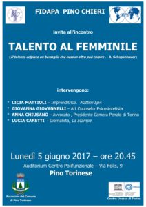 Il 5 giugno alle ore 20,45, all’Auditorium del Centro Polifunzionale di via Folis 9 la FIDAPA organizza un incontro su “I talenti delle donne: una risorsa per lo sviluppo sociale, economico e politico del nostro paese”. Intervengono: Licia Mattioli, imprenditrice, Mattioli SpA; Giovanna Giovannelli, Art Counselor Psicosintetista; Anna Chiusano, avvocato, Presidente Camera Penale di Torino; Lucia Caretti, giornalista, La Stampa. Con il Patrocinio del Comune di Pino e del Centro Unesco di Torino.