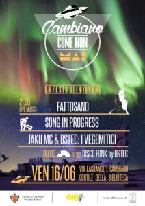 Venerdì 16 giugno  “ Cambiano come non mai”, questo è il titolo della serata.  ” L’ evento nasce dalla volontà di noi giovani amministratori del Comune. Volevamo organizzare un evento musicale che possa essere uno strumento di aggregazione per i giovani del territorio. E’ un evento del tutto nuovo e nella sua prima edizione “, mi riferisce Martina Gizzi, giovane Consigliere con delega. La serata si svolgerà nell’ area verde antistante la Biblioteca Civica Jacomuzzi. Ospiterà cantanti e musicisti amatoriali di Cambiano e di Santena. Sarà anche una serata informativa; verranno presentati e pubblicizzati i diversi servizi che il Comune, attualmente mette a disposizione dei giovani. – Martina perché nel cortile di una biblioteca?          “Perché è qui che risiede il Centro studio Giovani “. – Mi dici tre parole che accomunano libri e musica? “ Fantasia, passione, amicizia “. Conclude aggiungendo “ Entrambi sono anche divertenti, fantasiosi e magici“. ( Antonella Rutigliano )