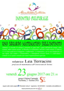 Venerdì 23 giugno, ore 21 salone comunale di Sciolze prosegue la serie di incontri culturali in collaborazione fra le associazioni Montaldo Cultura e Sapori di Sciolze . La professoressa di matematica dell’Università di Torino LEA TERRACINI, già ospite lo scorso anno, sarà la relatrice.UNO SGUARDO MATEMATICO SULL’INFINITO Abstract: il concetto di infinito è presente in quasi tutti i campi dell’attività umana: nelle scienze, nelle scienze sociali, in filosofia e in letteratura, nell’arte e nella musica. E tuttavia vi è in esso qualcosa di sfuggente e inafferrabile. La matematica, con la sua semplicità e il suo rigore, può aiutare a comprenderlo e a distinguerne le diverse forme. INGRESSO GRATUITO