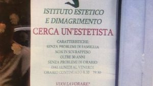 La Cgil Asti, attraverso lo sportello “Ad Personam”, denuncia le palesi discriminazioni apparse in un annuncio di lavoro affisso in una vetrina di un un centro estetico cittadino. Il sindacato punta il dito sul carattere apertamente offensivo della singolare ricerca di personale nei confronti delle donne : “Cercasi estetista senza problemi di famiglia – recita l’annuncio – non in sovrappeso, di oltre 30 anni, dal lunedì al venerdì, disponibile a lavorare con orario continuato dalle 8.30 alle 19.30”.