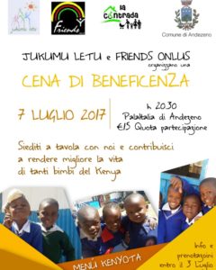 Cena solidale patrocinata dal Comune di Andezeno e organizzata dalle due associazioni andezenesi che sostengono progetti per i i bimbi in Kenia. La cena si terrà il 7 luglio presso il Palaitalia di Andezeno e il ricavato verrà utilizzato in parti uguali dalle due associazioni Jukumu Letu e Friends per attività destinate ai bambini kenioti. Quota di partecipazione 15 euro, iscrizioni entro il 3 luglio.La serata sarà anche l’occasione per sensibilizzare la cittadinanza sui temi dell’accoglienza e dell’integrazione, sui quali anche l’amministrazione comunale di Andezeno si sta impegnando in vista della realizzazione del progetto di accoglienza rifugiati Sprar.