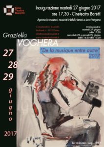 Al Cineteatro Baretti, in via Baretti 4 a Torino, ritorna, dal 27 al 29 giugno, la pittura di Graziella Voghera, che realizza i suoi quadri nello studio di San Salvario. E per questo appuntamento con il pubblico e gli esperti propone un gruppo di opere sul tema «De la musique entre autre», mentre si possono anche vedere composizioni floreali, nature morte, figure, immagini di una ricerca figurativa che tende all’espressionismo.