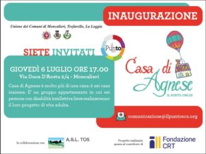Casa di Agnese è a Moncalieri, borgata Moriondo ed è un grande appartamento al primo piano di un piccolo condominio ai piedi della collina.E’ il primo gruppo appartamento di tipo B del territorio di Moncalieri, Trofarello e La Loggia: una casa in cui persone con disabilità intellettiva lieve convivono contando sull’aiuto di educatori professionali e operatori sociosanitari. Si tratta di un progetto gestito dalla cooperativa sociale Il Punto e realizzato con il contributo di Fondazione CRT. La mission è quella di realizzare un progetto di vita adulta, attraverso interventi educativi mirati: oltre al prendersi cura di sé e del proprio ambiente abitativo, le persone sono coinvolte in percorsi di inclusione. Educatori professionali e operatori socio sanitari garantiscono una presenza costante tutti i giorni dell’anno e co-progettano il percorso di vita della persona, attivando opportunità e favorendo l’accesso alle risorse del territorio.“Sei persone cominciano qui e ora il loro progetto di vita adulta in autonomia, in un contesto rispettoso delle loro speciali necessità e capace di valorizzarne i talenti e le potenzialità.”- spiega Paolo Montagna, Presidente dell’Unione dei comuni di Moncalieri, Trofarello e La Loggia. “E’ una scommessa vinta ma è anche una responsabilità condivisa con tutta la comunità: la responsabilità di essere disponibili a rallentare quando incontriamo gli abitanti di Casa Agnese: per salutare, per conoscersi, per lasciarsi un po’ cambiare la vita da chi va più piano”.“Grazie alla collaborazione tra l’Ucio Tutele dell’Unione dei Comuni ed il Tribunale di Torino è stato possibile creare un servizio utile alla comunità e al contempo capace di garantire la giusta rendita a due persone tutelate proprietarie dell’appartamento”- spiega l’Assessore ai servizi sociali Silvia Di Crescenzo.Il nome della casa è quello di Agnese, mancata all’improvviso un anno fa, operatrice sociosanitaria della cooperativa il Punto, Trofarellese, che ha lavorato per anni nei servizi per disabili .Spiega Ruggero Sorrentino il Presidente della Cooperativa il Punto: “Il nome del gruppo appartamento ricorda l’impegno di Agnese nel lavoro sociale ed il suo legame con questo territorio. Il servizio è il frutto di una co-progettazione tra tutte le diverse figure professionali coinvolte ed è la risposta, condivisa con i servizi pubblici del territorio, alla domanda di vita autonoma ma protetta espressa da giovani adulti con problematiche intellettive comportamentali. Un ringraziamento speciale a Fondazione CRT per avere sostenuto il progetto con un contributo economico”.
