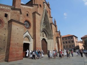 Il 4 luglio è passato da Chieri un gruppo internazionale di 40 suore Salesiane che si stanno preparando ad emettere la loro professione perpetua: che diventeranno, cioè, suore per sempre. Il percorso di preparazione alla vita religiosa prevede, infatti, una periodo di 10 anni: verifica e orientamento della propria chiamata (un anno), postulato (un anno), noviziato (2 anni), voti annuali o biennali (sei anni). Al termine di questo lungo cammino, dopo una preparazione intensa, si emettono i voti perpetui, esprimendo in questo modo la propria volontà di vivere per sempre da persona consacrata. Uno degli elementi importanti é conoscere la spiritualità dei propri fondatori, per questo le Figlie di Maria Ausiliatrice (chiamate anche Salesiane) percorrono ogni anno i passi di Santa Maria Mazzarelo a Mornese e di San Giovanni Bosco ai Becchi di Castelnuovo, a Chieri e a Torino. Le principali tappe chieresi sulle orme dello studente e poi chierico Giovanni Bosco sono: il Duomo, meta quotidiana della sua preghiera, il Caffè Pianta, posto del suo apprendistato, il Seminario e la Chiesa di San Filippo, luogo della sua formazione sacerdotale. Sotto la guida del Salesiano, don Enrico Lupano e della Figlia di Maria. Ausiliatrice, sr Paola Casalis, anche le sorelle Salesiane hanno ripercorso riflettendo queste tappe della vita chierese del Santo dei giovani.