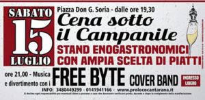 Dopo il successo del concerto del chitarrista Federico Poggipollini per il cartellone di Monferrato On Stage, Cantarana si prepara ad un altro appuntamento sotto le stelle. Questa sera, sabato 15 luglio, tutti in piazza per la Cena sotto il Campanile. Appuntamento in piazza Don Giovanni Soria a partire dalle 19,30 con le proposte enogastronomiche della Pro Loco e delle associazioni del paese. Alle 21 musica della Free Byte cover band.
