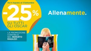 “Allenamente” è la promozione di agosto sui titoli Oscar del catalogo Mondadori. Grandi titoli, bestseller, in un formato agevole e ad un prezzo accessibile. Dal 4 Agosto al 3 Settembre non perdere l’occasione e Allenamente, ovvero allena la mente leggendo. Acquistando un Oscar avrai il 25% di sconto!