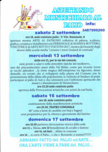 Sabato 2 settembre alle 18, nell’ambito della rassegna “Aspettando Montechiaro al Palio”, presso la sede del Comitato Palio in Via Vittorio Emanuele 8, si apre la mostra “Arte al Patrono”, collettiva di pittura, scultura, grafica, ceramica e installazioni, con personale di Marina Bottero, vincitrice di ‘Arte sotto i voltoni 2017”. Mostra dei bozzetti degli alunni della scuola media ‘creiamo i nuovi foulard di contrada’.