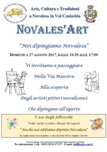Arte, cultura e tradizioni a Novalesa in Val Cenischia. Domenica 27 agosto, dalle 10,30 alle 17, “Noi dipingiamo Novalesa”, passeggiando nella via maestra alla scoperta degli artisti pittori novalicensi che dipingono all’aperto. Nella Casa degli Affreschi, i disegni dei ragazzi del corso di pittura a cura di Maria De Los Angeles.