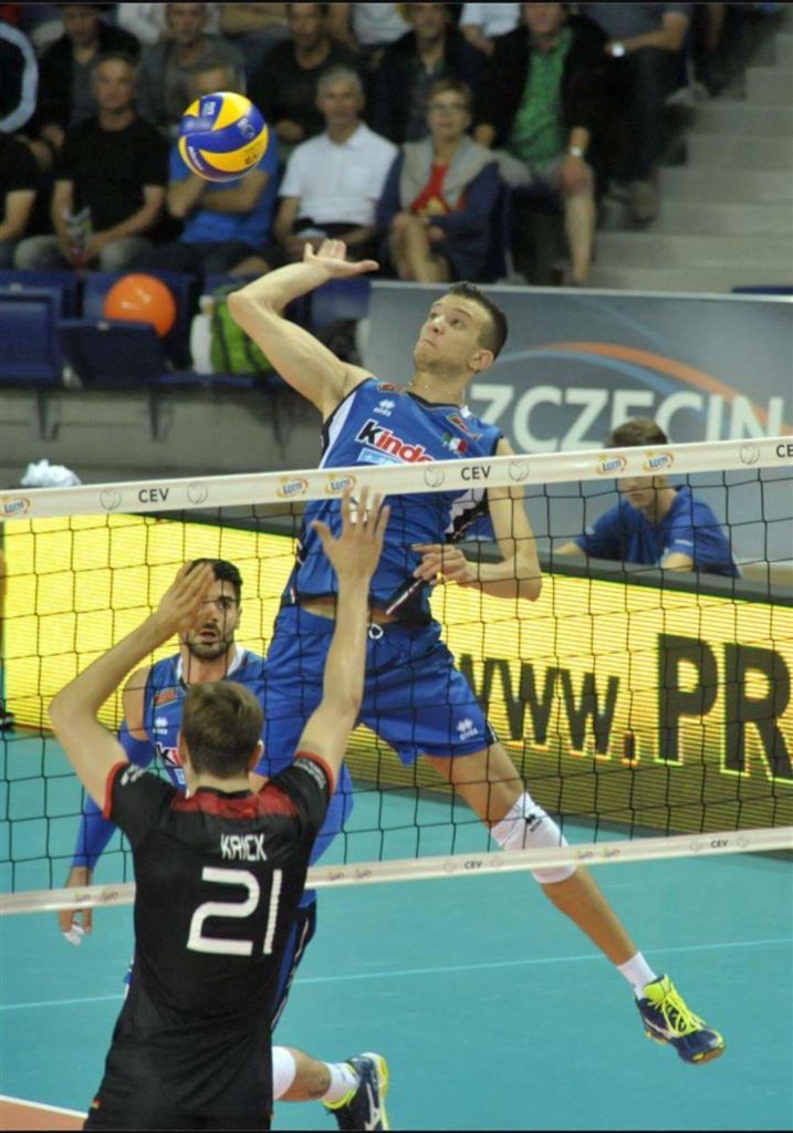 L’avventura della nostra nazionale a Stettino, in Polonia, è iniziata venerdì 25 agosto con una sconfitta al tie-break 3-2 contro la Germania. Il tecnico Blengini ha scelto di schierare Giannelli in regia, Lanza e Antonov schiacciatori, Piano e il cambianese Mazzone al centro, Colaci libero. Gli Azzurri, partiti un po’ contratti perdendo il primo set, erano riusciti a ribaltare l’iniziale svantaggio vincendo il secondo e il terzo, ma poi l’andamento dell’incontro è andato a favore dei tedeschi, costringendo l’Italia ad 1 solo punto nella classifica del girone, preceduti da Rep. Ceca e Germania.